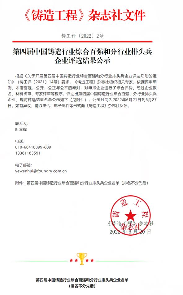 根據(jù)《關于開展第四屆中國鑄造行業(yè)綜合百強和分行業(yè)排頭兵企業(yè)評選活動的通知》(鑄工評〔2021〕14號)要求,《鑄造工程》雜志社組織相關專家,依據(jù)評審細則,本著客觀、公開、公正與公平的原則,對申報企業(yè)進行了綜...