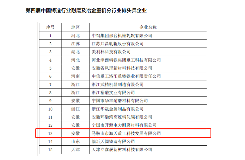 根據(jù)《關于開展第四屆中國鑄造行業(yè)綜合百強和分行業(yè)排頭兵企業(yè)評選活動的通知》(鑄工評〔2021〕14號)要求,《鑄造工程》雜志社組織相關專家,依據(jù)評審細則,本著客觀、公開、公正與公平的原則,對申報企業(yè)進行了綜合評價。經(jīng)過企業(yè)報名、材料初審、專家評審等程序,評選出第四屆中國鑄造行業(yè)綜合百強、分行業(yè)排頭兵企業(yè)。海天重工被評選為“第四屆中國鑄造行業(yè)耐磨及冶金重機分行業(yè)排頭兵企業(yè)“,這是海天重工獲得的象征行業(yè)地位的又一個標志性榮譽。