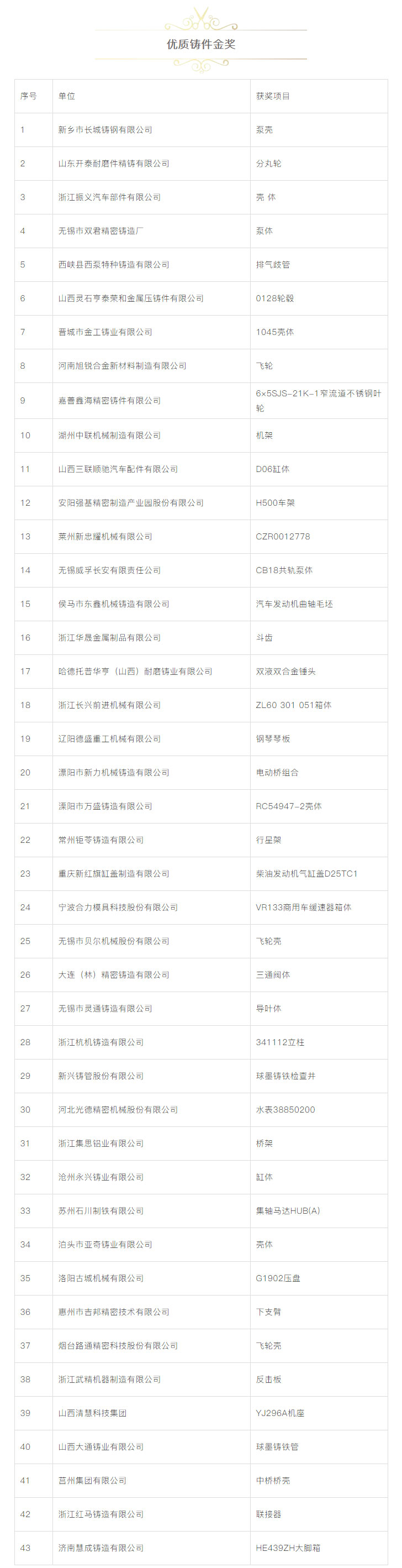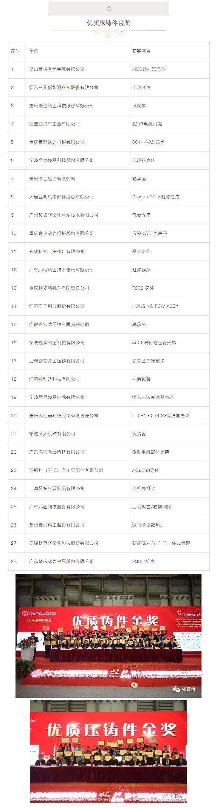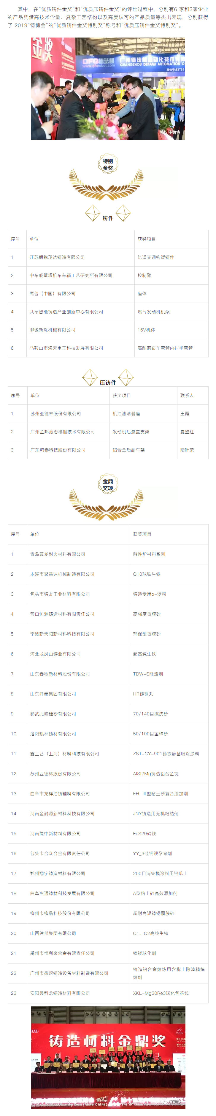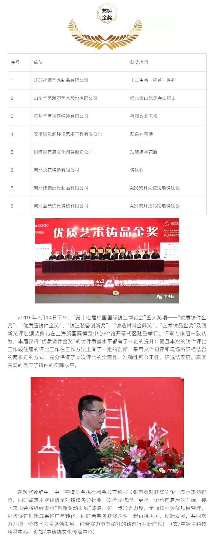 為了進(jìn)一步鼓勵鑄造行業(yè)科技創(chuàng)新,推動鑄造行業(yè)質(zhì)量工作,更好地服務(wù)于鑄造行業(yè)轉(zhuǎn)型升級,本著“評先獎優(yōu)”’的原則,中國鑄造協(xié)會在“第十七屆中國國際鑄造博覽會”及“第十三屆中國國際壓鑄工業(yè)展覽會”期間,繼續(xù)對參展的鑄件、壓鑄件、鑄造裝備、鑄造材料、藝術(shù)鑄品及四新技術(shù)開展了評比活動。本次評選活動得到廣大參展商的大力支持,共有154家企業(yè)的200余件展品參與申報(bào)評優(yōu)。
